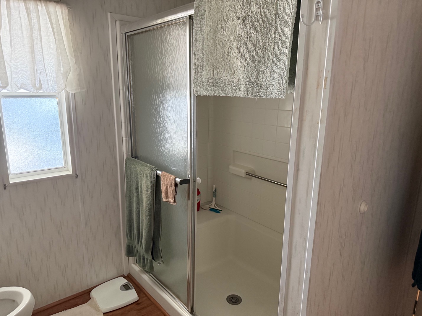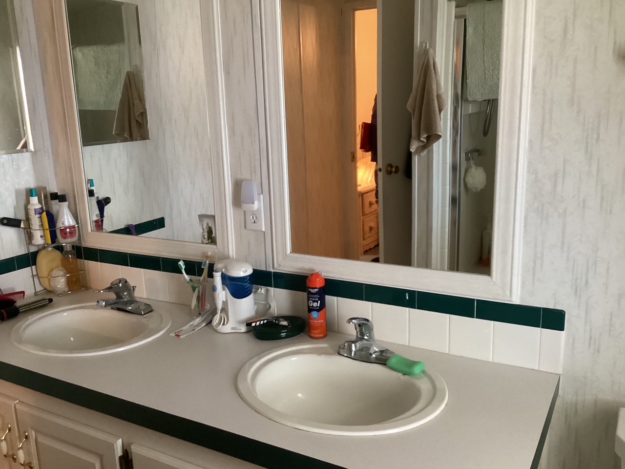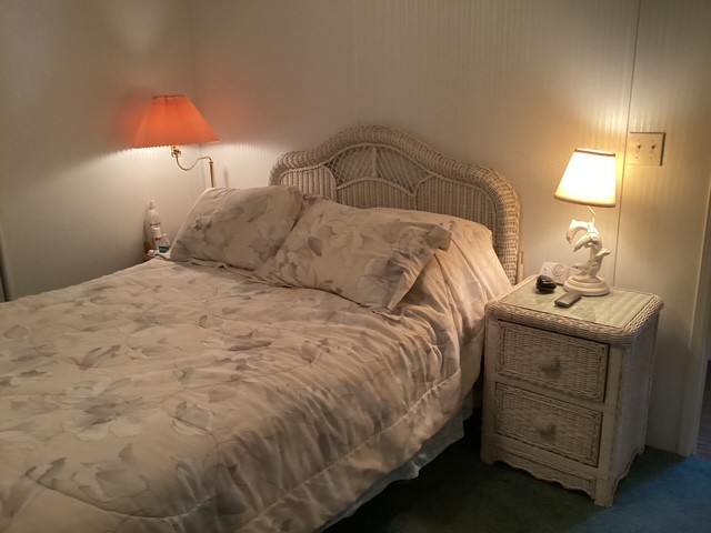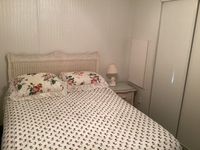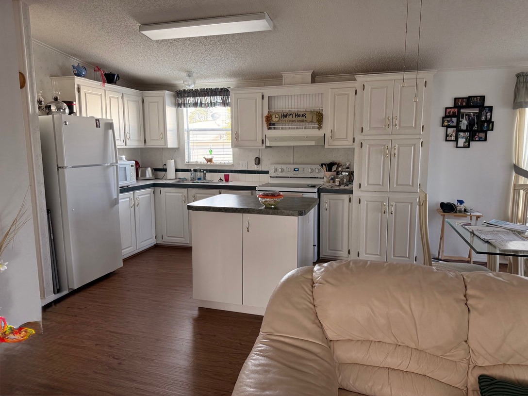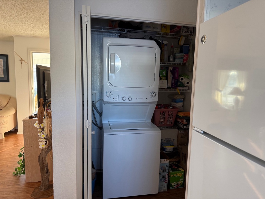 This spacious double-wide home features 2 bedrooms and 2 bathrooms. The primary bath offers a double-sink vanity and walk-in shower, while the guest bath includes a tub/shower combination. A stacked washer and dryer are conveniently located in the hallway closet.